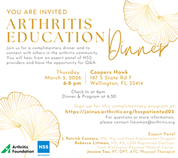 Please join us for a complimentary educational dinner hosted by the Arthritis Foundation at Cooper's Hawk in Wellington on Thursday, March 5, 2026, at 6 PM. You will hear from an expert panel of HSS providers, including orthopedic surgeon Dr. J. Patrick Connors, physical therapist Jessica Tau, and registered dietitian Rebecca Littman from Wellington Regional Medical Center.