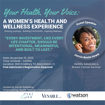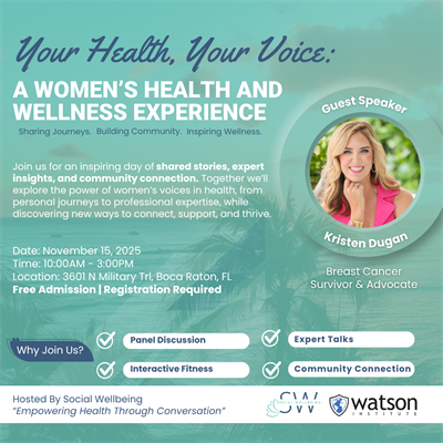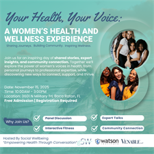On November 15, 2025, women across Palm Beach County will gather in Boca Raton for a first-of-its-kind immersive women's health event designed to create space for shared stories, practical support, and real connection. Your Health, Your Voice brings healthcare experts, journey speakers, and wellness partners together to bridge the gaps between office visits and restore human connection to women's healthcare. The result? A space for women to feel informed, heard, and supported.