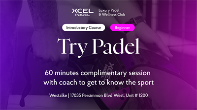 Discover Florida's fastest-growing sport! Join us for a FREE 60-minute introductory padel session with a professional coach at XCEL Padel & Wellness Club in Westlake. Perfect for complete beginners, this hands-on experience will teach you the basics of this exciting racquet sport that combines elements of tennis and squash.